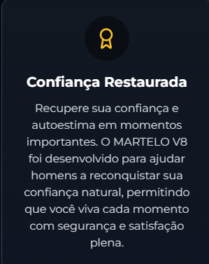 MARTELO V8 é um suplemento natural em cápsulas desenvolvido especificamente para homens que desejam tratar disfunção erétil e ejaculação precoce de forma natural, eficaz e segura. Com fórmula 100% natural e tecnologia americana, ele atua diretamente na causa dos problemas, não apenas nos sintomas. Diferentemente de remédios convencionais como Viagra e Tadalafila que oferecem apenas soluções temporárias, o MARTELO V8 foi criado após anos de pesquisa científica para proporcionar um tratamento definitivo, sem criar dependência. Nossa fórmula exclusiva trabalha para recuperar a potência sexual natural do homem, devolvendo confiança e satisfação em todas as relações íntimas.
